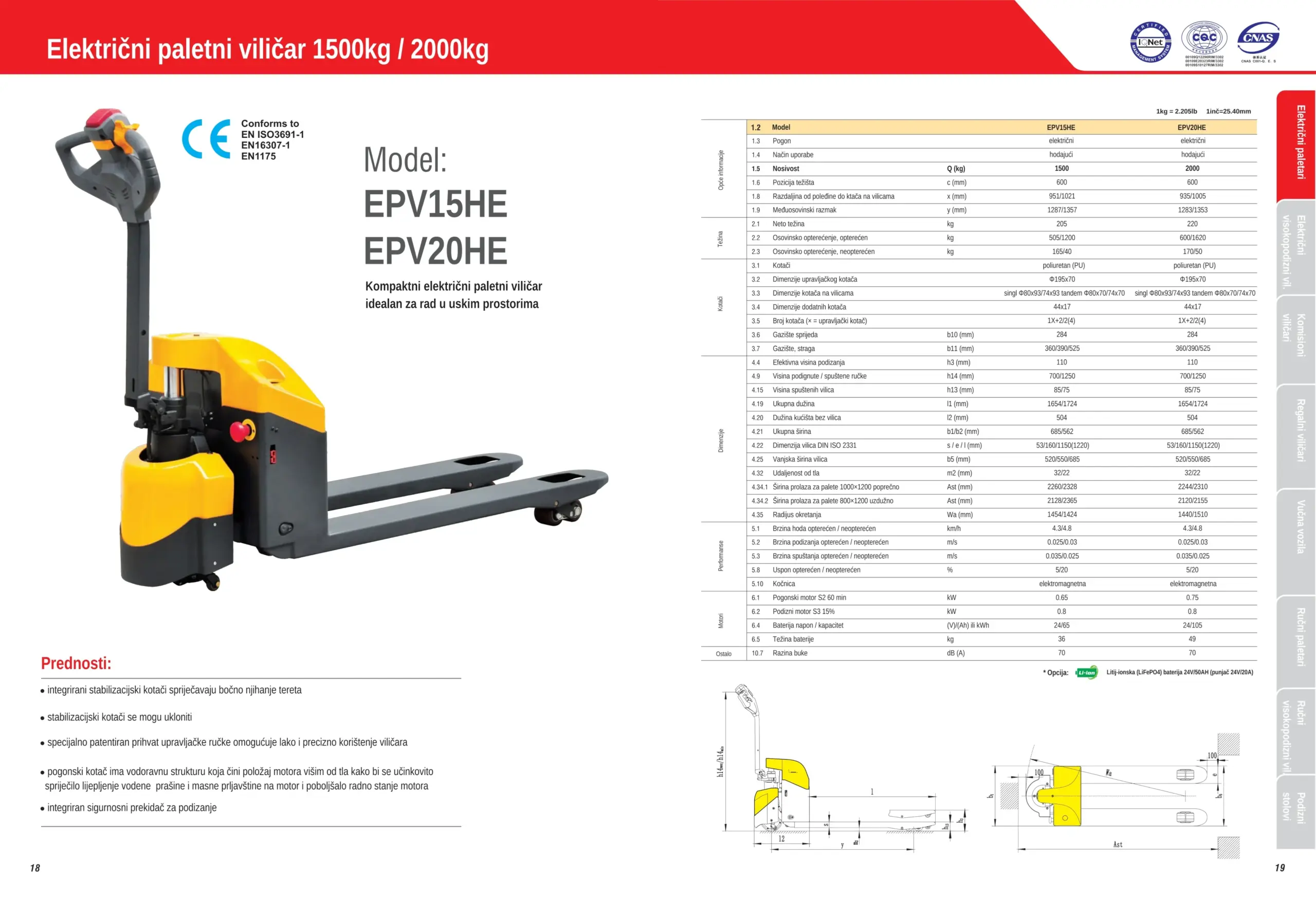 Električni paletni viličar 1500-2000kg GEL baterija – Električni paletni viličari – Osnovne specifikacije:
