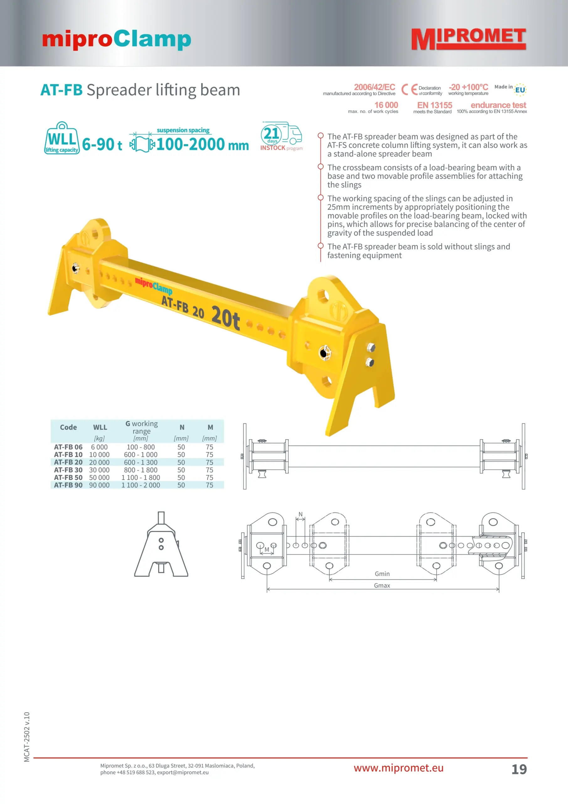 Model: AT-FB. Robusna i svestrana traverza s podesivim rasponom ovjesa. Omogućuje precizno balansiranje težišta tereta. Idealna za rad s prefabrikovanim elementima. Nosivost od 6 do 90 tona.