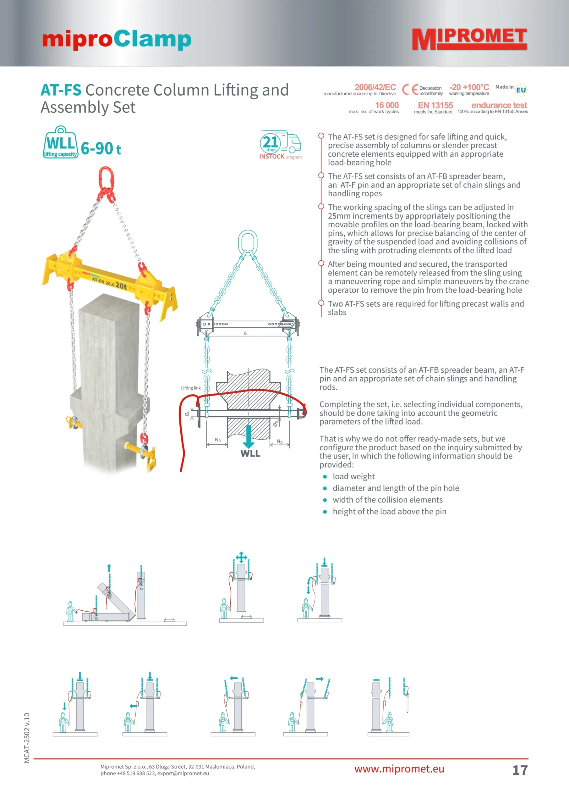 Model: AT-FS. Kompletan sistem za sigurno podizanje i preciznu montažu betonskih stupova i zidova. Sastoji se od traverze, klina s daljinskim otpuštanjem i priveznica. Konfiguracija prema zahtjevu.