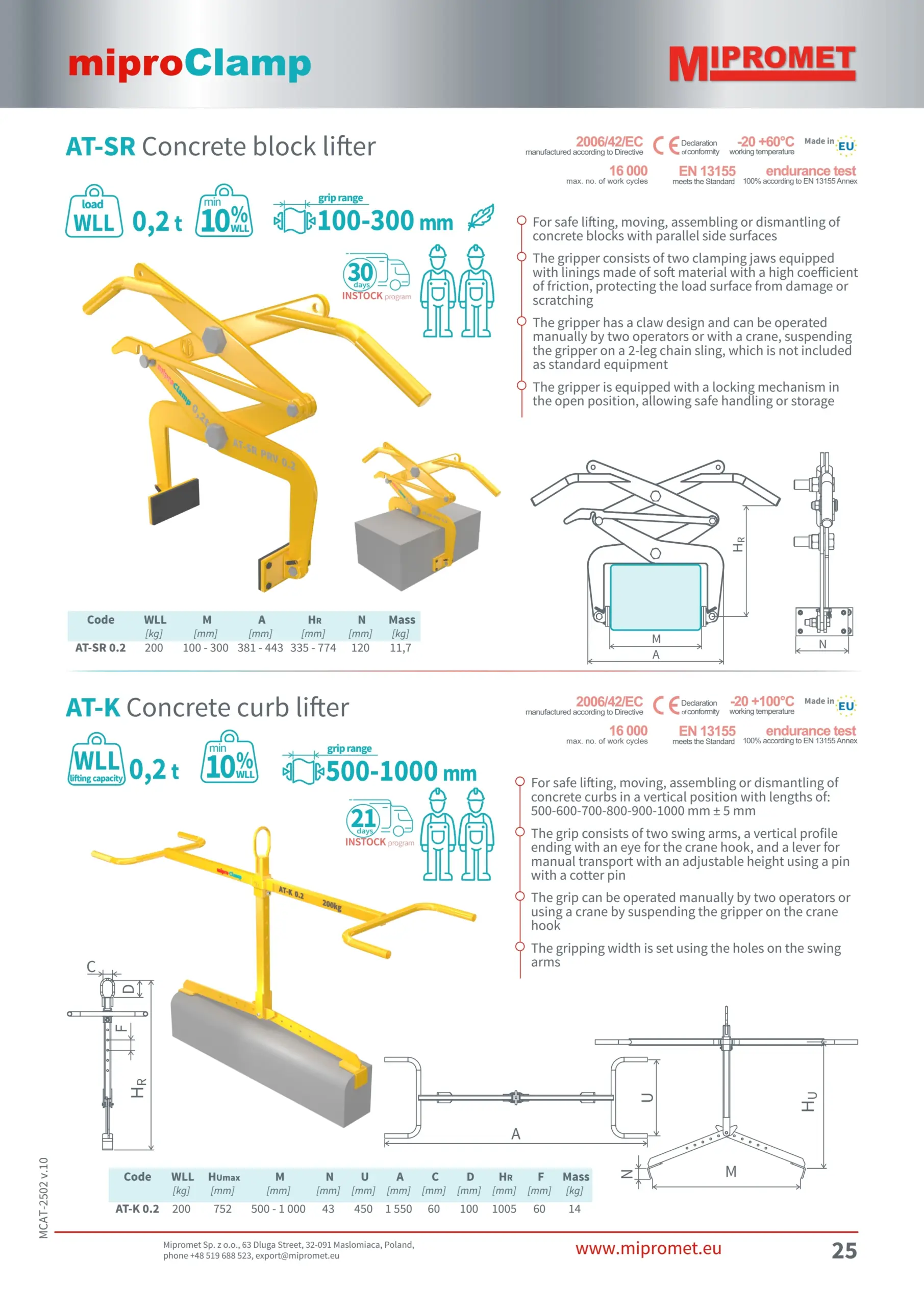 Model: AT-SR 0.2. Svestrana hvataljka za betonske blokove koja se može koristiti ručno (2 radnika) ili s dizalicom. Štiti blokove od oštećenja. Raspon 100-300mm, nosivost 200 kg.